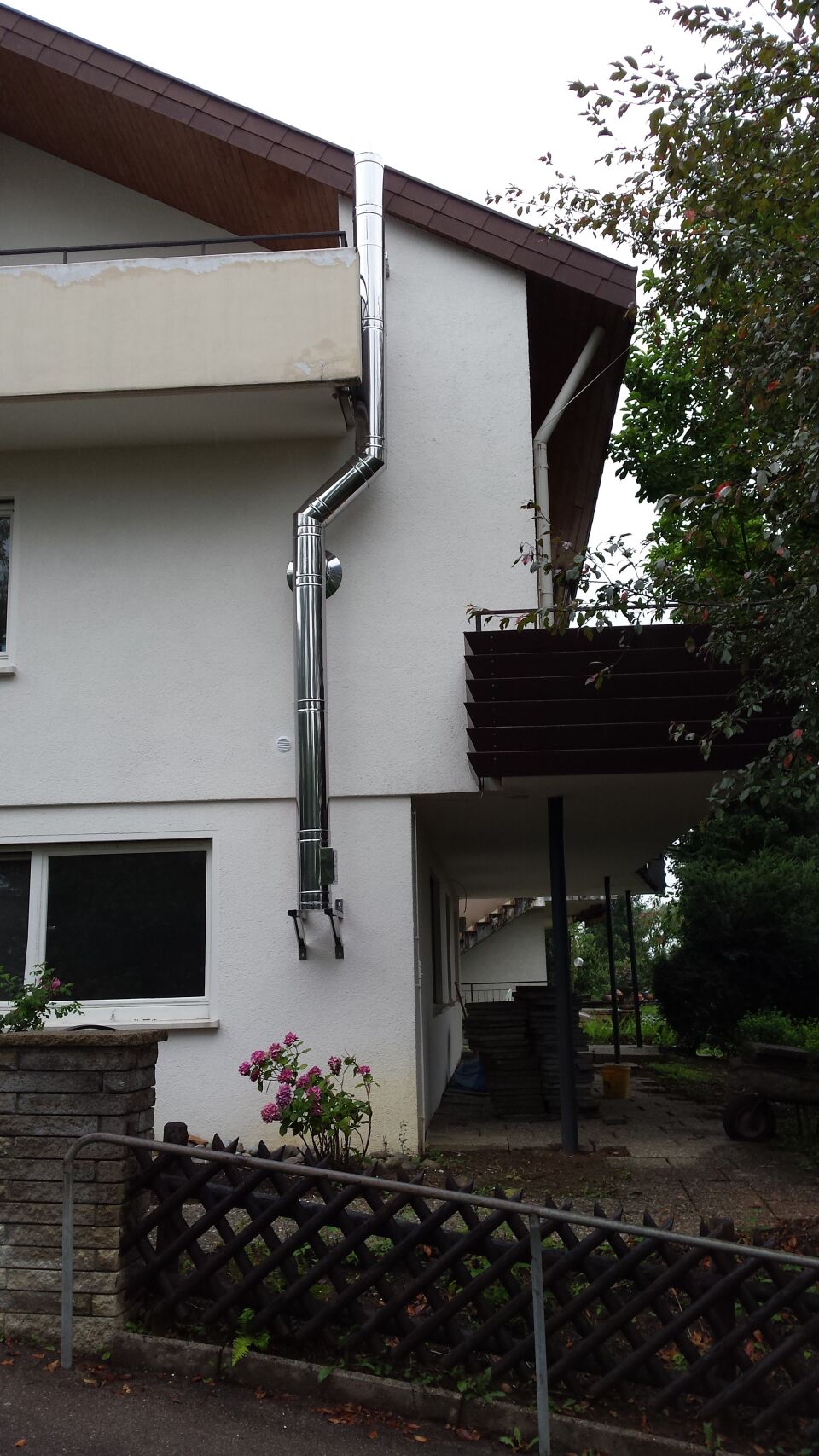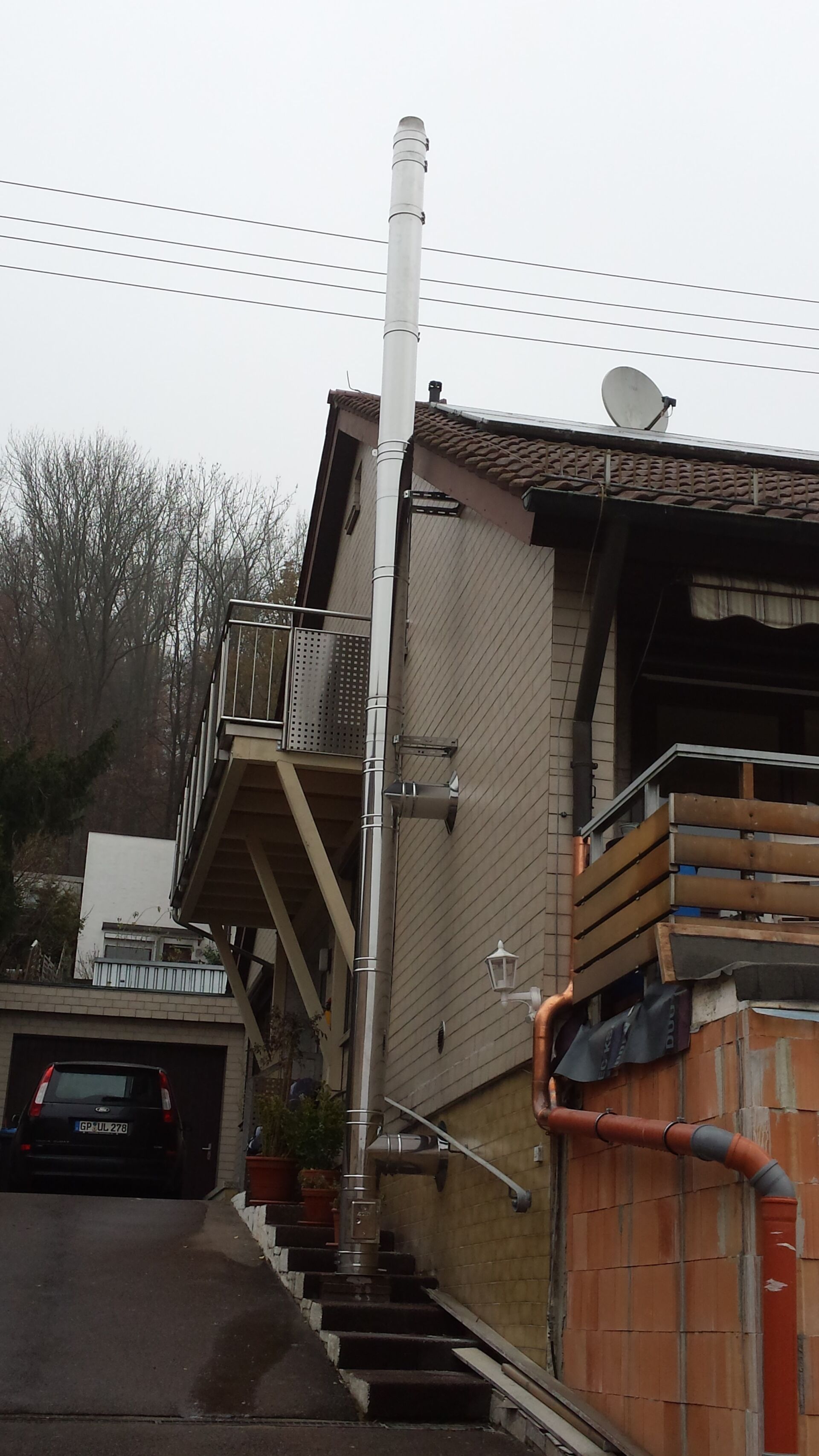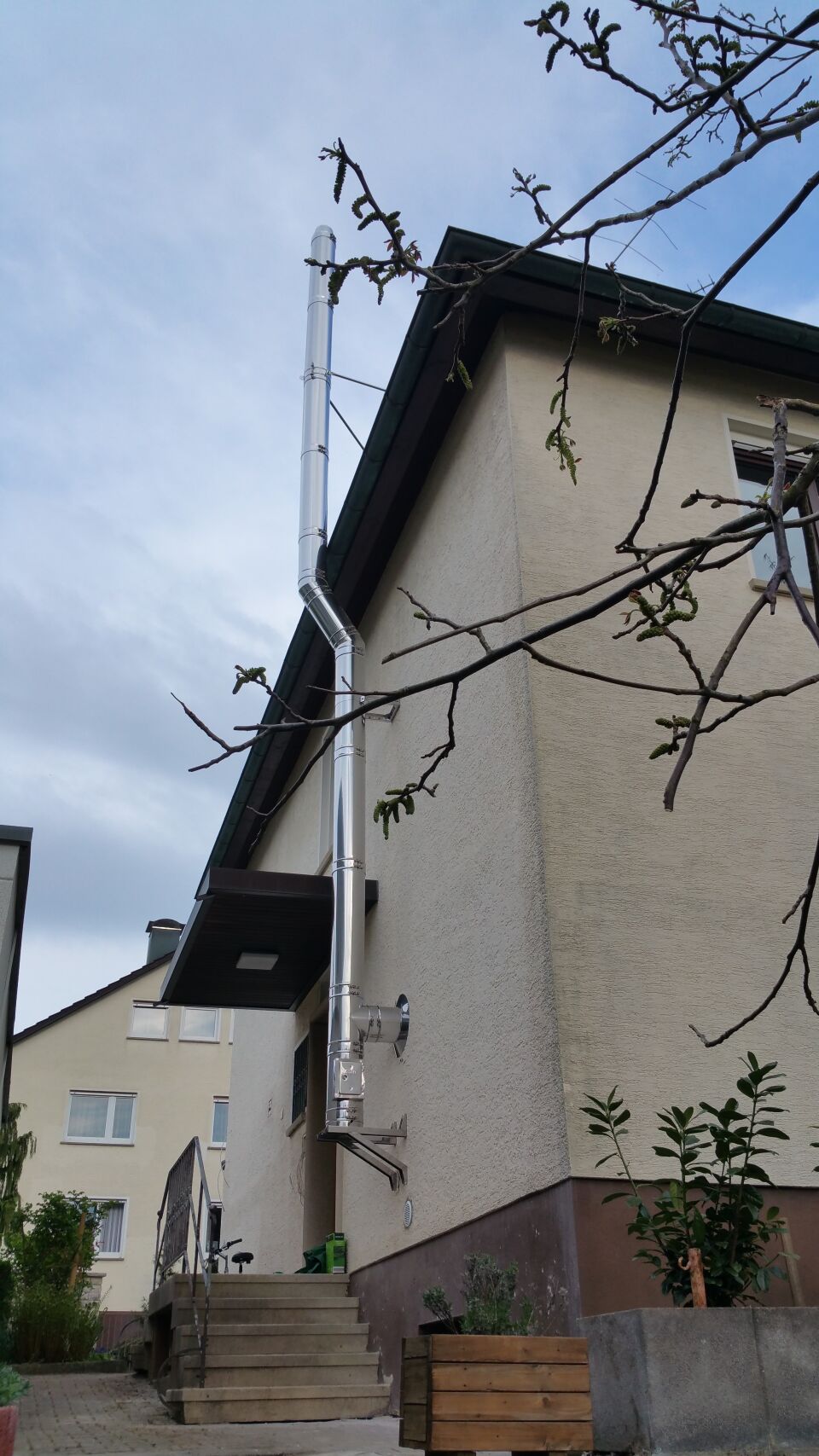 Es gibt die Möglichkeit nachträglich einen Edelstahlschornstein außen am Haus zu montieren.