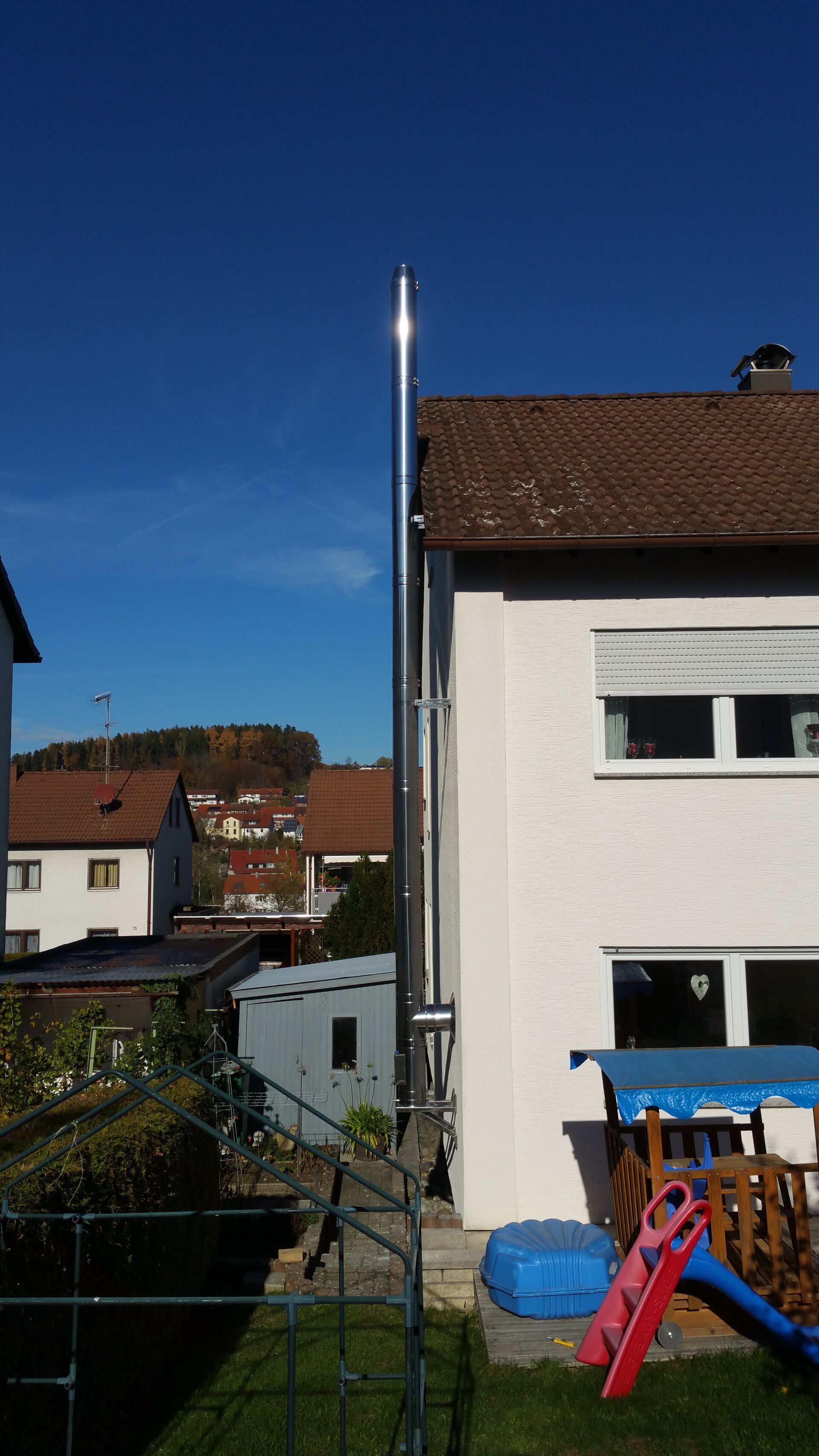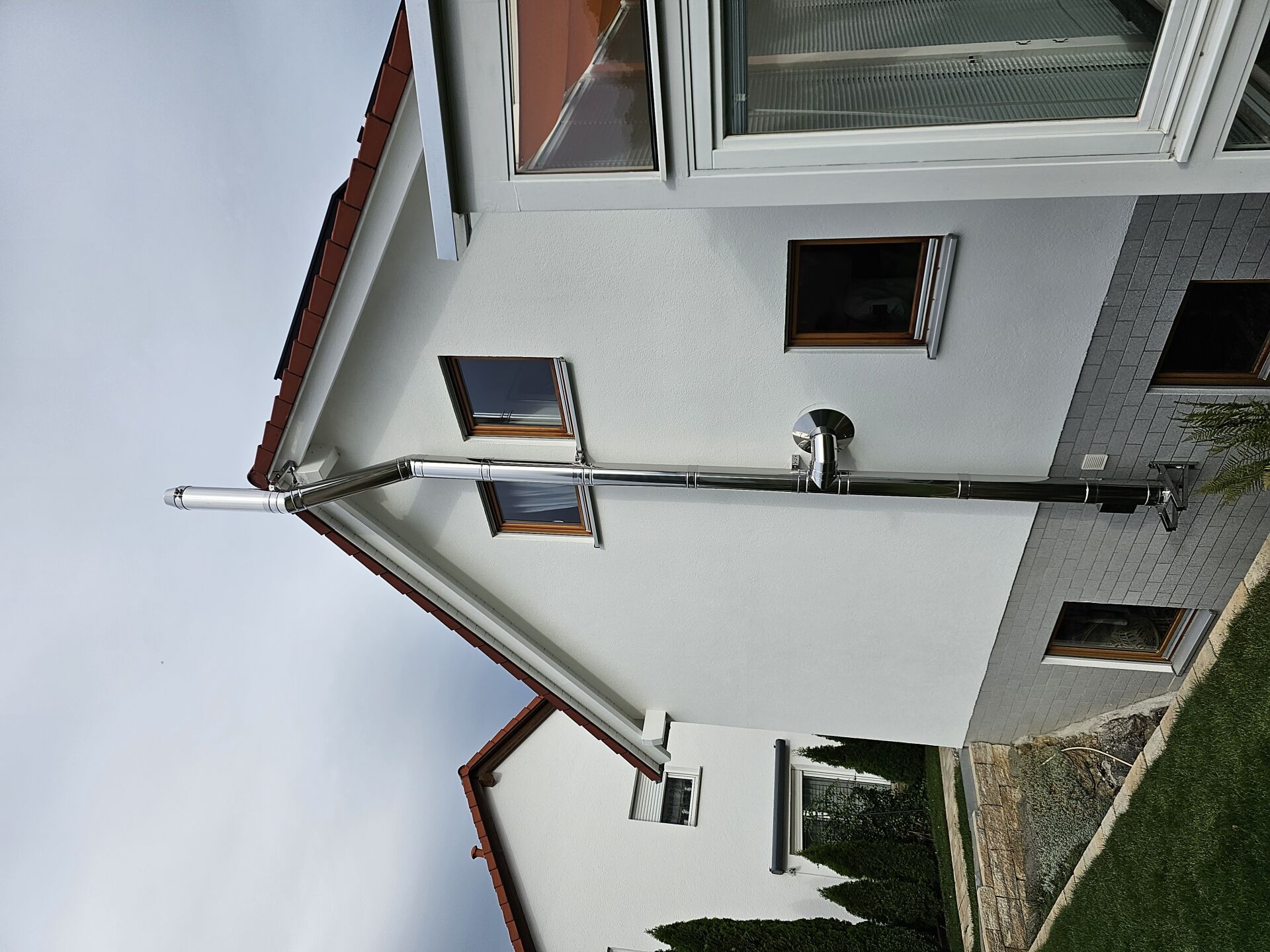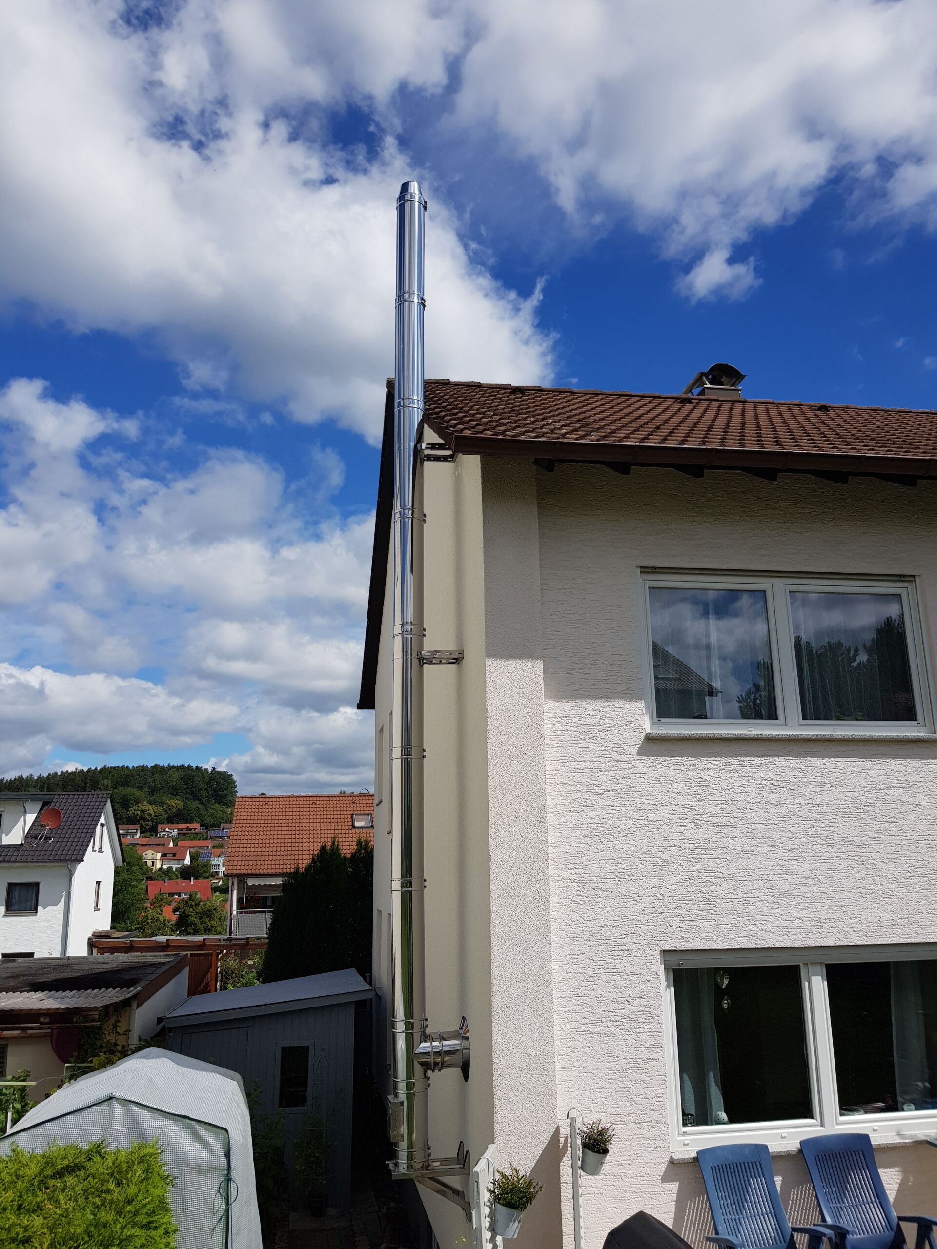 Es gibt die Möglichkeit nachträglich einen Edelstahlschornstein außen am Haus zu montieren.